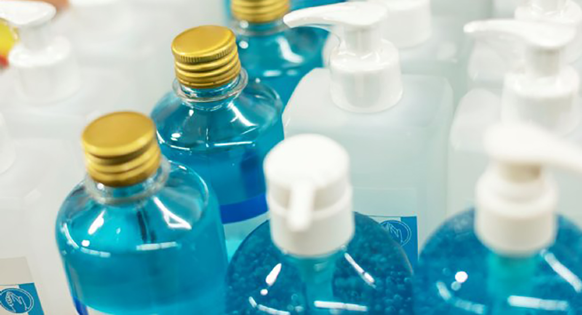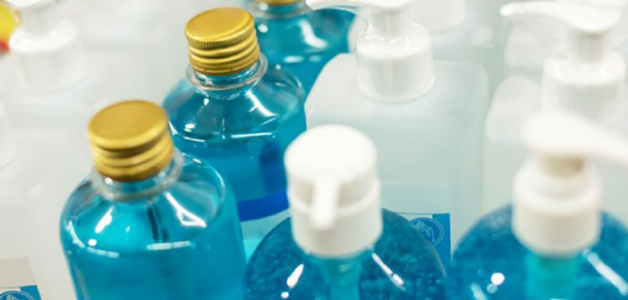 #PraTodosVerem: a imagem mostra vários frascos de álcool em gel ou sabonete líquido, alguns com tampas douradas e conteúdo azul-turquesa, e outros com bombas brancas e líquido incolor ou com pequenas esferas azuis. Os frascos estão dispostos em uma superfície clara, criando uma sensação de profundidade com alguns focados e outros desfocados ao fundo. Fim da descrição.