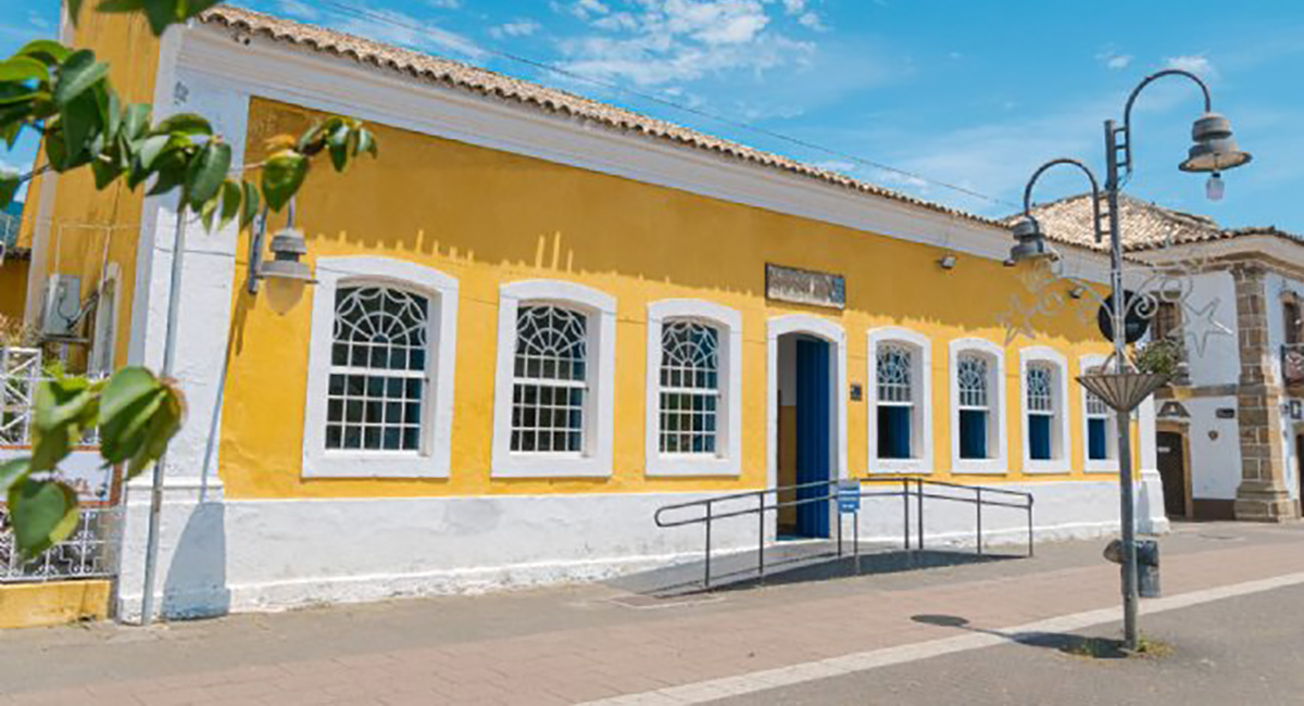 #PraTodosVerem: fotografia em uma rua de paralelepípedos sob céu azul com poucas nuvens. Ao centro da imagem, está a Casa da Cultura, um prédio histórico de fachada amarela com detalhes brancos e janelas de estilo colonial com moldura arqueada. A entrada principal possui uma porta azul e uma rampa de acessibilidade. À direita, há um poste com luminárias duplas e enfeites metálicos em forma de estrelas. Algumas folhas verdes aparecem desfocadas no canto esquerdo da imagem. Fim da descrição.