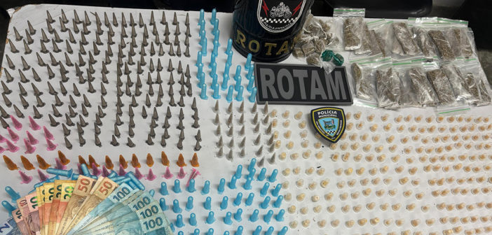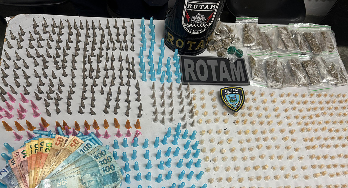 No interior da mochila, foram localizadas 882 porções de entorpecentes, sendo 557 de cocaína (792,59 gramas), 219 de crack (216,97 gramas) e 106 de maconha (429,19 gramas). Também foram apreendidos R$ 980 em dinheiro, distribuídos em seis notas de R$ 100, quatro de R$ 50, sete de R$ 20, três de R$ 10 e cinco de R$ 2.