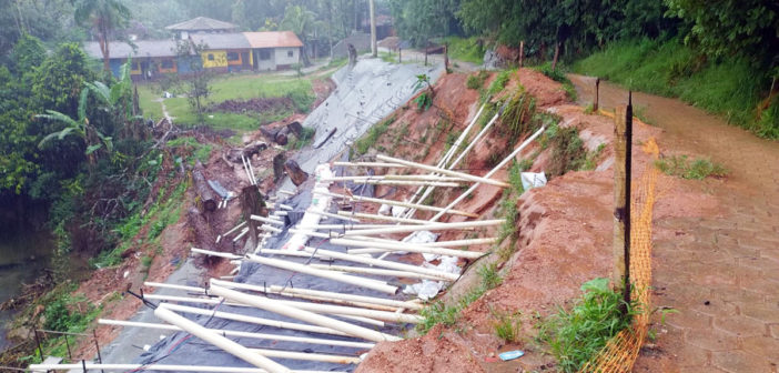 A obra de contenção definitiva de talude e recuperação da infraestrutura viária da Estrada Beira Rio, iniciada após os danos causados pela tragédia de 19 de fevereiro de 2023, também foi impactada pelas chuvas do último domingo, com registro de escorregamento de terra e queda de árvore.
